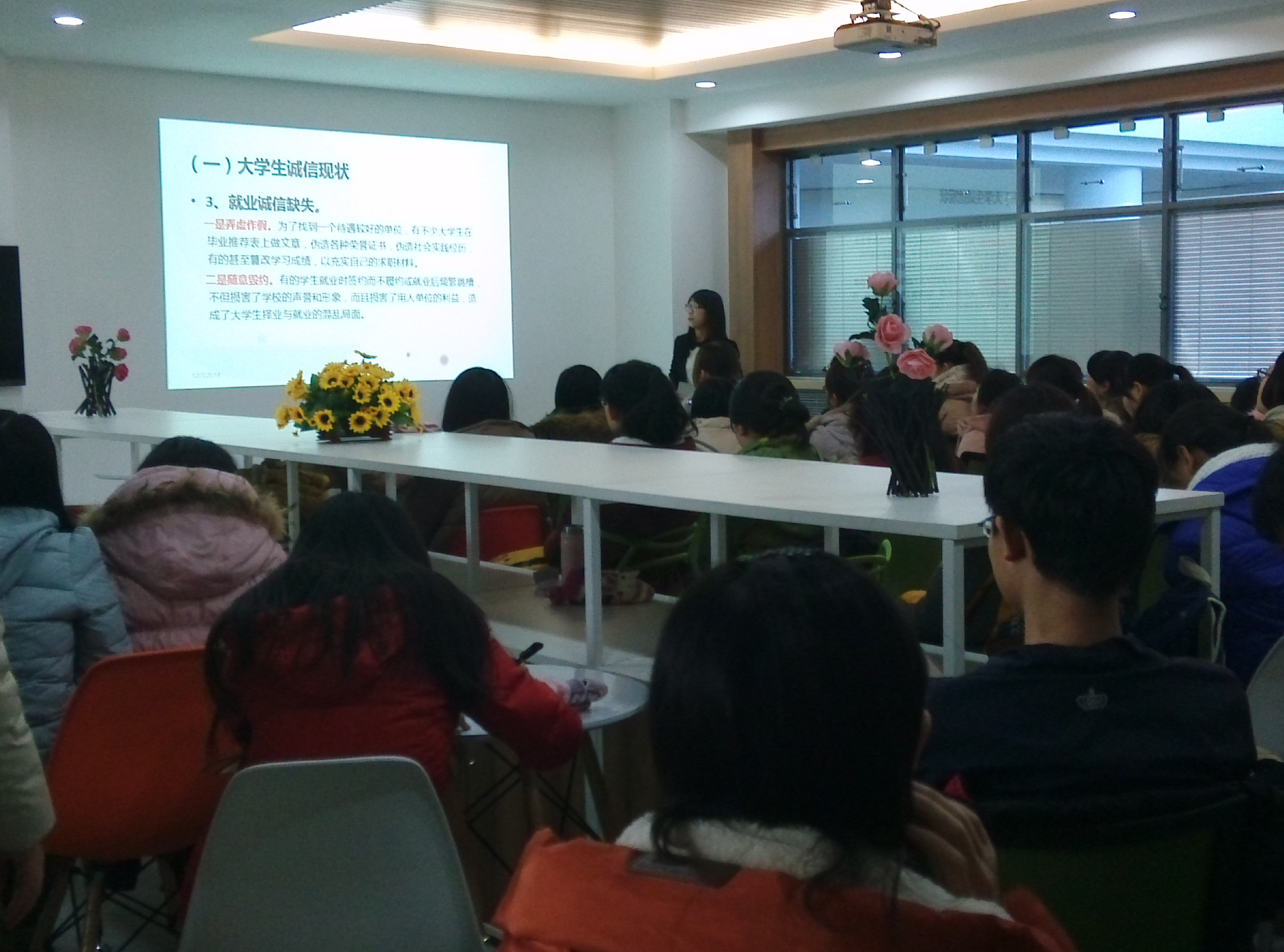 要求研究生同学积极加强自身道德修养,做诚信的践行者,努力做到学思并重,内省慎独,知行统一,做一个诚信的人。针对即将到来的学期考试,与会同学积极倡议: