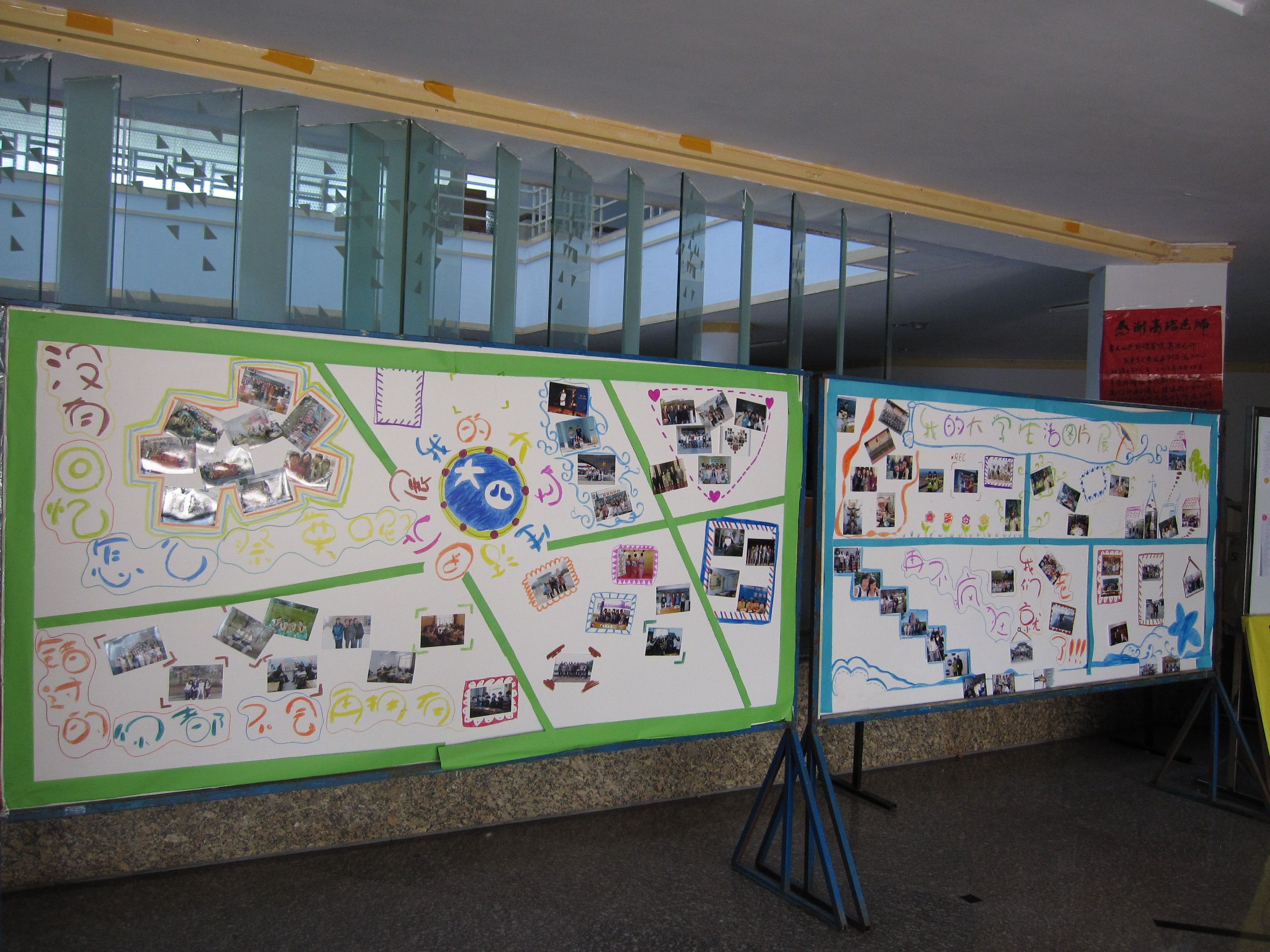 通过从毕业生中收集整理他们四年来的经典照片,制作了囊括毕业生精彩纷呈的大学学习、生活、娱乐等各种题材的照片展板,并将展板在外语楼一楼大厅展出。展板上“没有回忆怎么祭奠呢?”、“错过的你都不会再拥有”、“再不疯狂我们就老了”的话语,让浓浓的离别情绪弥漫开来。当老师同学们进入到外语楼,纷纷被炫彩的大学生活图片展报所吸引,驻足观看。一些低年级的学弟学妹们站在展板前相互交流,祝福师哥师姐们顺利离校,并畅想自己毕业离校时的样子。