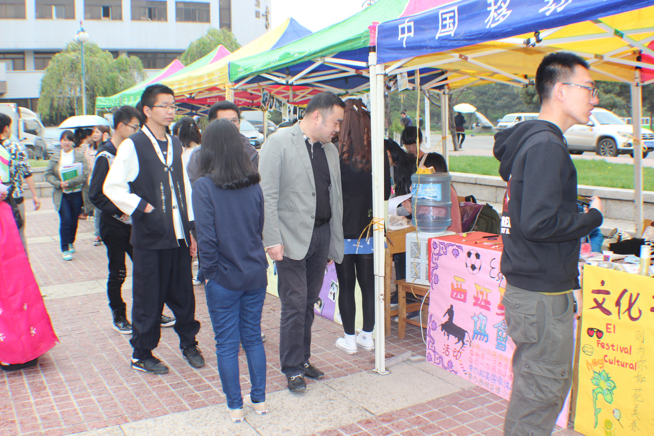 七个社团在广场设列展台,让到场的同学能更为近距离、全方位的尽享文化大餐。各大展台详尽的展现了各语种所代表的地域文化,风景名胜以及珍馐美味,更邀请了不少外国友人前来助兴。文化节举办当天细雨纷纷,但活动并没有受到天气影响,仍吸引了不少学生撑伞前来驻足欣赏、参与其中。