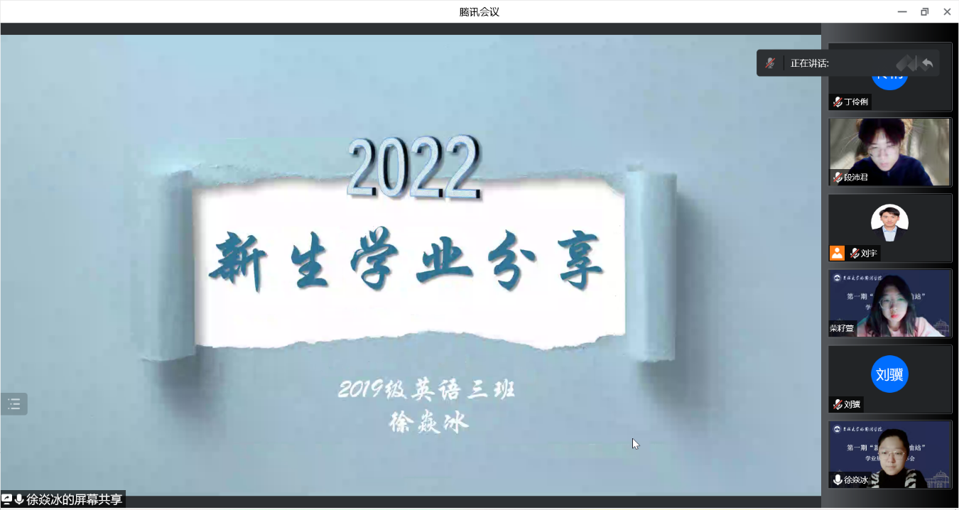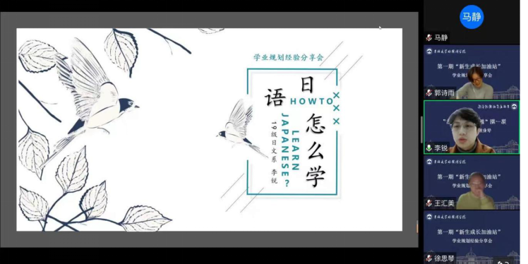 2020级英文系刘骥同学主持,2019级英文系徐焱冰、2019级俄文系马静、2019级日文系李锐、2019级西文系徐政奇、2019级朝文系李涵做学习经验分享。2022级学生辅导员刘宇老师、极速赛车