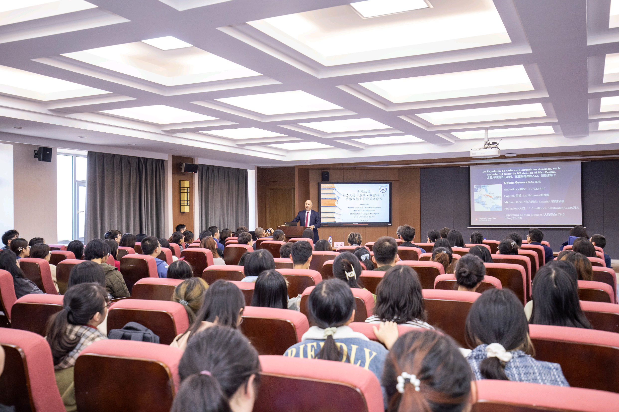 西班牙文系150余名师生聆听了这次讲座。佩雷拉大使从地理、教育、医疗卫生和经济社会发展等方面向西班牙文系师生介绍了古巴的概况,并重点讲述了古巴和中国友好关系的发展情况。佩雷拉大使的讲座极大地激发了同学们对拉美国家国情的兴趣以及学习西班牙语的热情。