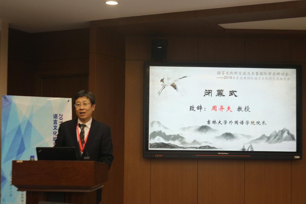 院长周异夫教授分别致闭幕词。秦明利教授在致辞中肯定了东北亚国际语言文化研究基地自2014年成立以来,已形成的高度国际化、学术前沿性、研讨主题具有理论性与实践性等特点,盛赞本次研讨会圆满地完成了大会主题所涉及的内容讨论。周异夫教授首先对各位专家学者的到来表示感谢并对明年的东北亚国际语言文化研究基地年会表示期待。他谈到,东北亚国际语言文化研究基地的基本理念是国际化,各个国家与民族在自己的语言文化发展轨迹上都有自己的特色,但从整体而言彼此之间具有千丝万缕的联系,基地的年会就是希望从语言、文化、翻译学以及国别研究等整体上的共享,让学术研究能更上一层楼。
