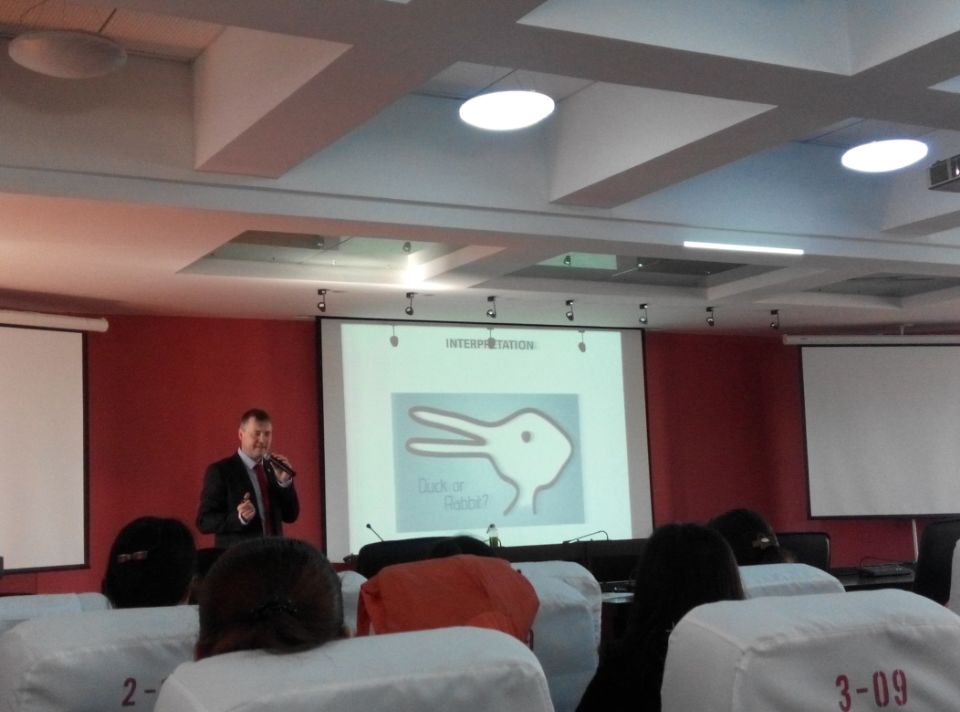 在本次短期课程中,Piotr Blumczynski博士主要从跨学科角度探讨翻译学,从翻译的本质、角色、意义、影响等出发,并结合语言学知识,加深和拓宽了研究生同学对翻译的理解及认识。在为期四天的集中课程里,Piotr Blumczynski博士首先探讨了翻译的本质,翻译与解释的关系,指出两者之间的区别往往很难分辨。他还通过隐喻的方式,将翻译与画画、做饭、传送、游戏、解题、移植、丛林探索等等各类活动进行对比,从各个侧面体现翻译的特点。随后,Piotr Blumczynski博士详细讲解了符号语言学的几项重要内容----index,icons,and symbolities----通过符号语言学知识提出对翻译的启示,即翻译的过程会不可避免地对原文产生作用,就此解释了为什么有些人认为翻译是一种不可避免的邪恶行为。Piotr Blumczynski博士又在接下来的讲座中探讨了翻译及语言学中的一些基本问题,如意思的含义是什么,意思的各个层面,及典型意思。另外,Piotr Blumczynski博士从认知语言学角度探讨翻译,讨论了照相理论,翻译中角度、方向等问题。最后,Piotr Blumczynski博士简要地介绍了自己的新研究,从哲学的各个领域探讨翻译的本质,翻译可能像人的思维一样无处不在,无法控制,通过将翻译与哲学中解释学的位置调换,更加深刻地探究翻译活动。Blumczynski幽默风趣,授课内容丰富,课堂上善于激发学生,开展师生互动,课下也与学生积极沟通交流,获得听课师生的一致好评。
