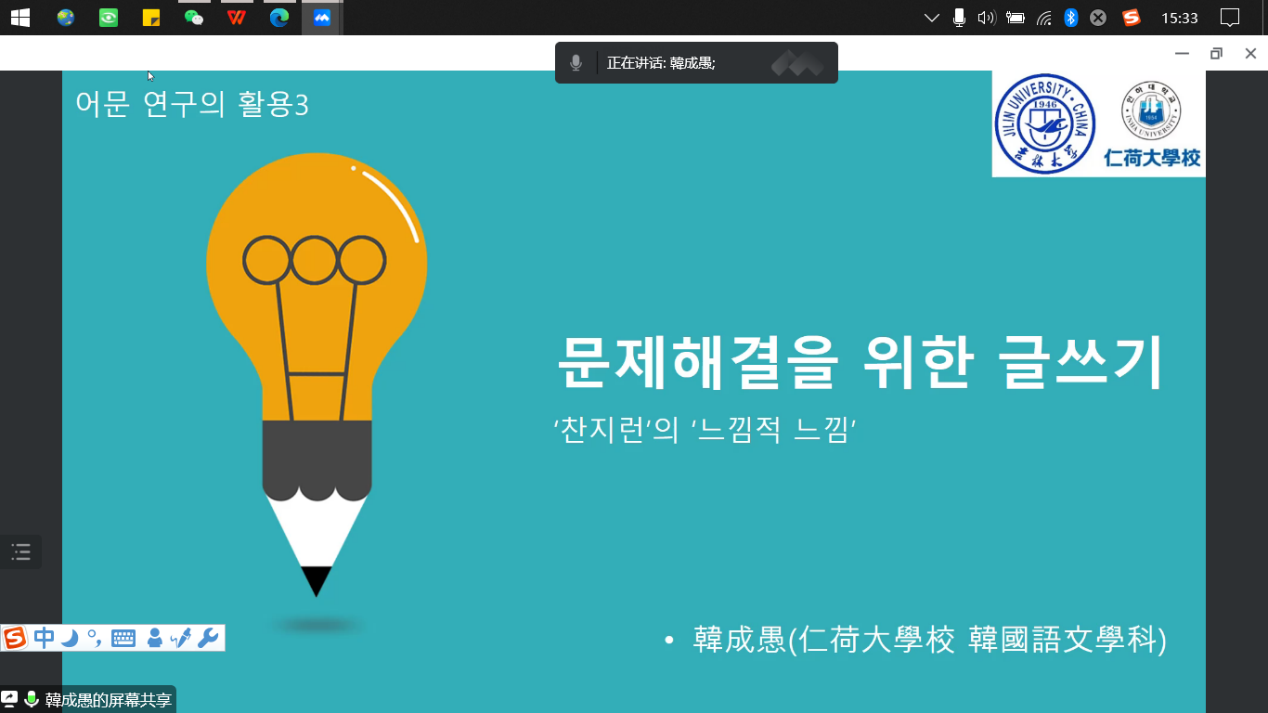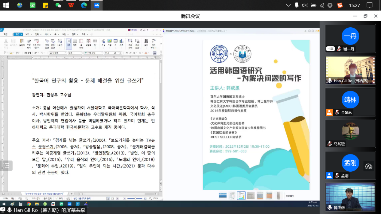 邀请,2022年12月2日15时30分,首尔大学国语国文系博士、韩国仁荷大学韩国语学专业教授、博士生导师、文化放送(MBC)韩国语委员会委员、2016年朝鲜日报作家奖获得者韩成愚老师在云端通过腾讯会议平台做了一场主题为“活用韩国语研究——为解决问题的写作”的学术讲座,讲座由朝文系外教韩吉路老师主持,参加讲座的人员有极速赛车