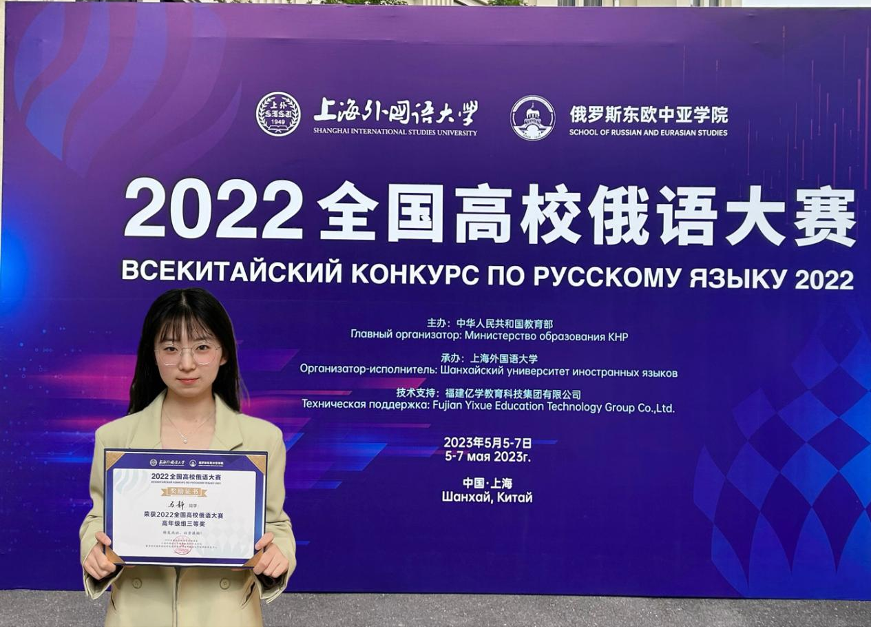 在高年级组中荣获三等奖,获得国家留学基金委全额资助赴俄罗斯留学、进修的资格。马静同学在比赛中充分展现了俄文系学子扎实的专业基础、优秀的综合语用能力,以及踏实努力、积极进取、拼搏向上的精神。