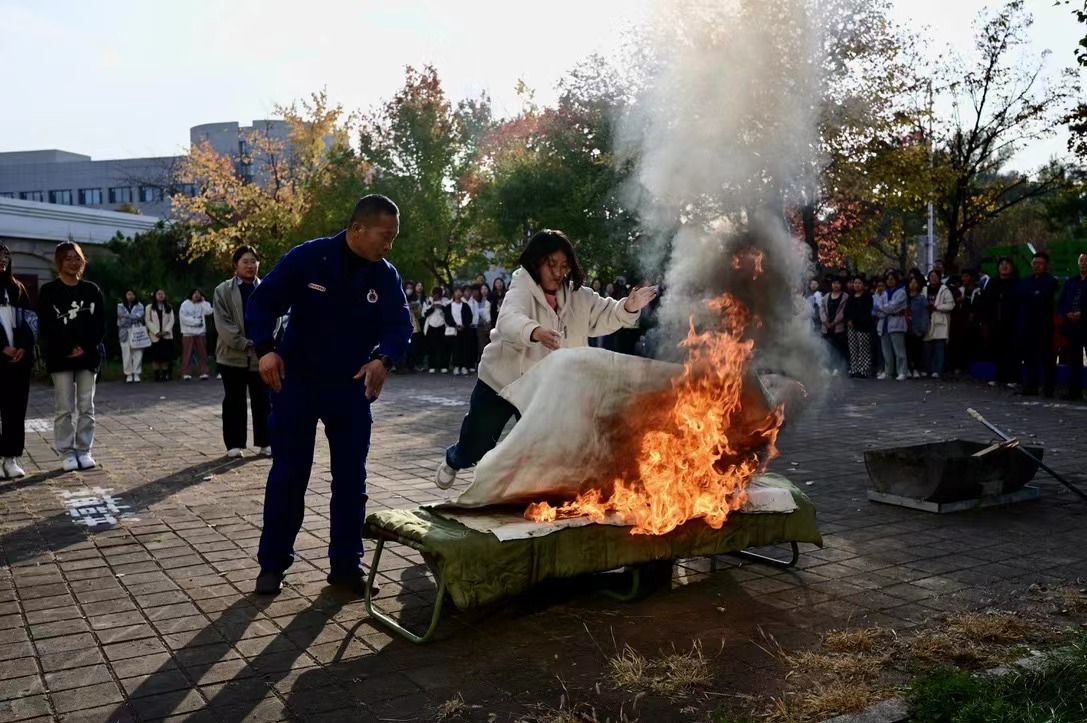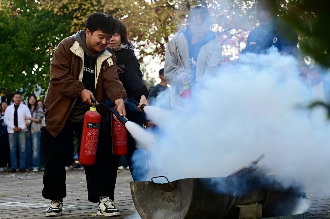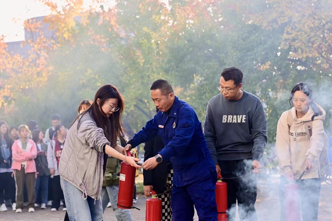 首先,董老师以实际发生的数场火灾为例,结合外院实际学习、工作环境,详细介绍了安全防火的知识及消防演练的流程。消防演练开始后,专业人员在外语楼内模拟了火灾现场的烟雾与警报,楼内全体师生员工和讲座现场的学生有序撤离至外语楼西门小广场。集合后,师生们现场学习了多种火源的灭火方法并进行了实践,亲身体验了如何在真实火灾场景中保障自身安全。