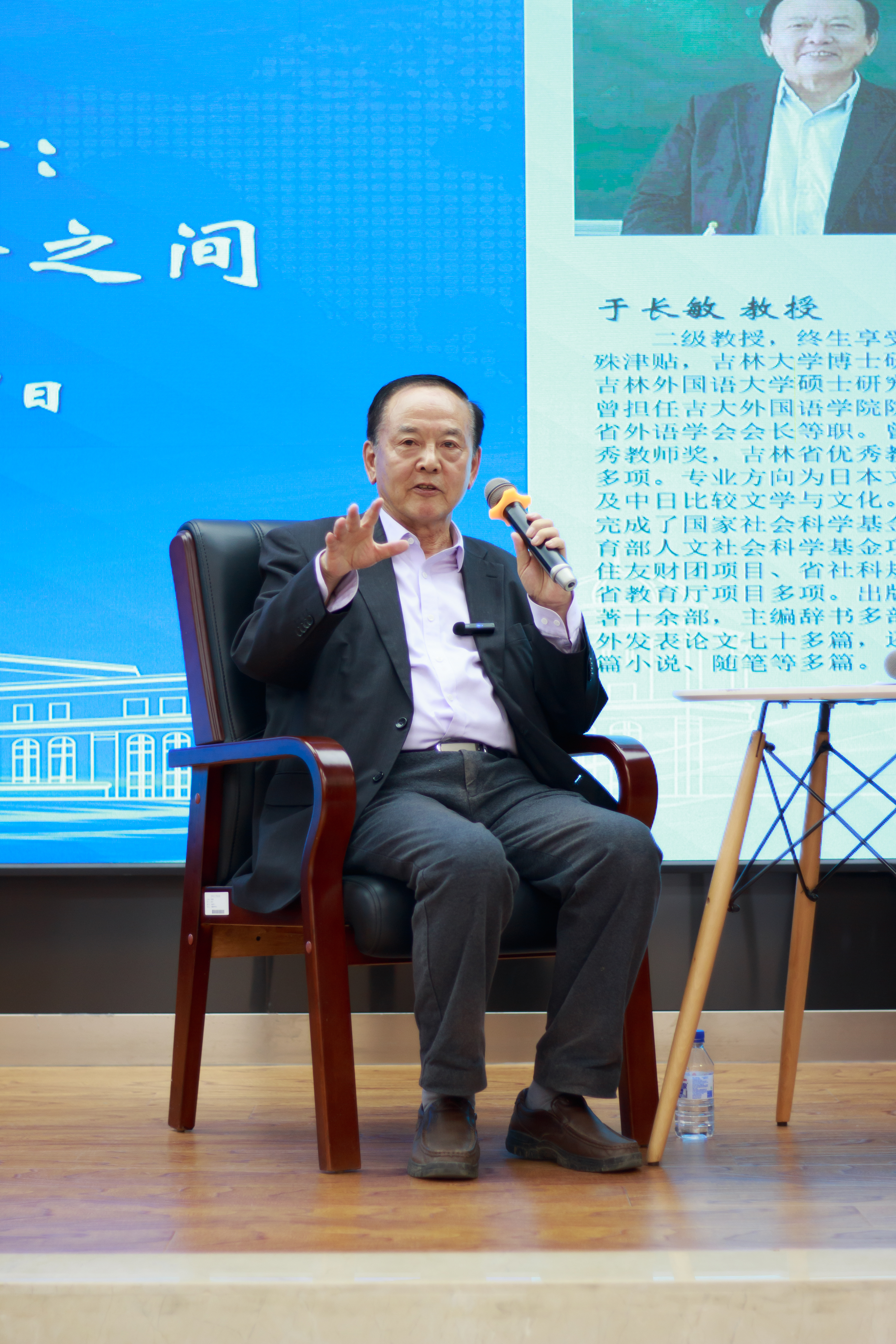 副院长房颖老师主持。两位名师以《文学翻译:外译与中译之间》为题开展了高水平探讨。于长敏教授广引实例,强调了在汉译日场景中汉语水平、日语水平以及对文化背景知识的深入掌握三者缺一不可。林少华教授则以日译英为对照组,分析了中国译者在日译汉场景中的优势与劣势,强调了译本中艺术情韵的重要性。面对当今AI技术给翻译行业带来的冲击,两位教授均表示AI未来虽可做到“信”和“达”,但难以在“雅”的层面超越人类,完全取代人工文学翻译。